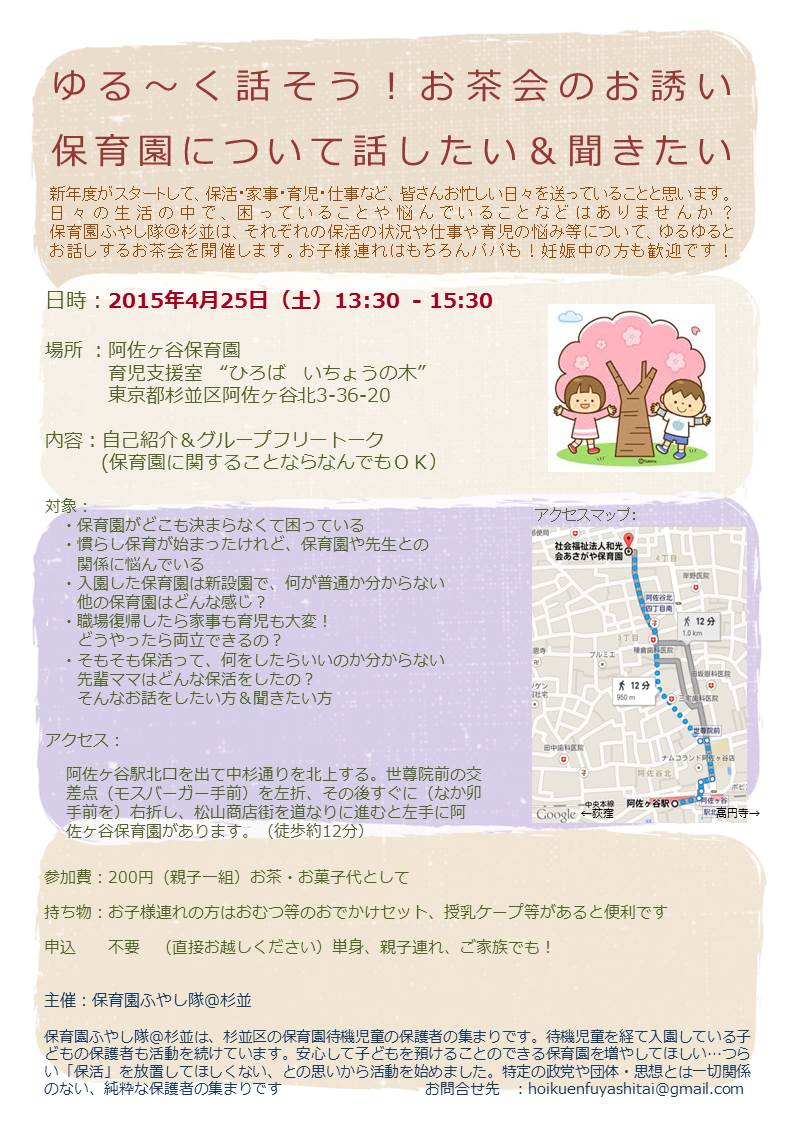 4/25(土)お茶会を開催します 01_イベント 2015年04月04日 新年度がスタートして、保活・家事・育児・仕事など、皆さんお忙しい日々を送っていることと思います。日々の生活の中で、困っていることや悩んでいることなどはありませんか?保育園ふやし隊@杉並は、それぞれの保活の状況や仕事や育児の悩み等について、ゆるゆるとお話しするお茶会を開催します。 ・保育園がどこも決まらなくて困っている。 ・慣らし保育が始まったけれど、保育園や先生との関係に悩んでいる。 ・入園した保育園は新設園で、何が普通か分からない。他の保育園はどんな感じ? ・職場復帰したら家事も育児も大変!どうやったら両立できるの? ・そもそも保活って、何をしたらいいのか分からない。先輩ママはどんな保活をしたの?などのお悩みを持つ方々、ぜひお茶会への参加をお待ちしています。以下、お茶会の詳細です。■日時:2015年4月25日(土) 13:30〜15:30■場所:阿佐ヶ谷保育園 育児支援室「ひろば いちょうの木」杉並区阿佐ヶ谷北3-36-20(地図はこちらをクリック) (阿佐ヶ谷駅北口徒歩約12分)阿佐ヶ谷駅北口を出て中杉通りを北上、世尊院前の交差点(モスバーガー手前)を左折、その後すぐに(なか卯手前)を右折し、松山商店街を道なりに9〜10分進むと左手に阿佐ヶ谷保育園が見えます。「ひろば いちょうの木」は道路沿い手前のお部屋です。■参加費:200円(親子一組)■当日の内容:自己紹介以外はフリートークです。ざっくばらんに話しましょう!※お子様連れの方はおむつ等のおでかけセット、授乳ケープ等があると便利です。■お申込み:お申込みは必要ありません。当日は、お気軽に会場へお越しください。なお、お茶会当日は、5月に実施する「異議申し立て」の書類を配布・提出できます。異議申し立ての当日に参加できない方は、4月25日(土)にお茶会の会場で、書類をお預かりいたします。お茶会の会場で異議申し立ての書類を提出する方は、【判子】を必ずお持ちの上、ご参加ください。【企画・運営】保育園ふやし隊@杉並Twitter https://twitter.com/fuyashitai_sugiBlog http://fuyashitai.blog.shinobi.jp/Facebook https://www.facebook.com/fuyashitai.suginami PR http://fuyashitai.blog.shinobi.jp/01_event/20150404tea-party4/25(土)お茶会を開催します